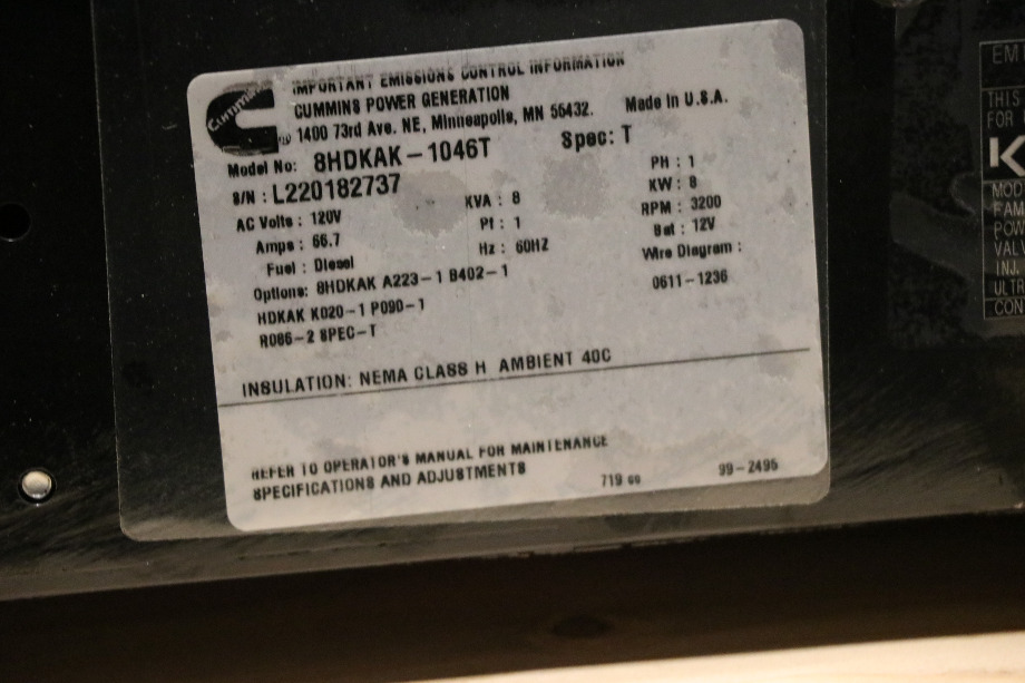 IN STOCK!! READY TO SHIP!! RV GENEARATOR QUIET DIESEL WEIGHT, SIZE AND SOUND LEVEL WORLDS LARGEST SELECTION OF USED RV/MOTORHOME PARTS FOR SALE. ALSO A SELECTION OF INTERESTING ITEMS RELATED TO INSURANCE SALVAGE. NOTE: ALL USED ITEMS AND PARTS ARE ALWAYS SOLD AS-IS WITH NO RETURNS. HOWEVER, AT VISONE RV, WE DO TEST ALL ELECTRICAL COMPONENTS - PRODUCTS. THEY ARE IN WORKING ORDER BEFORE SHIPPING OR PICK-UP SO THAT OUR CUSTOMERS CAN BUY WITH CONFIDENCE! ITEM AVAILABLE FOR SHIPPING. TO ORDER PLEASE CALL VISONE RV (606) 843-9889.